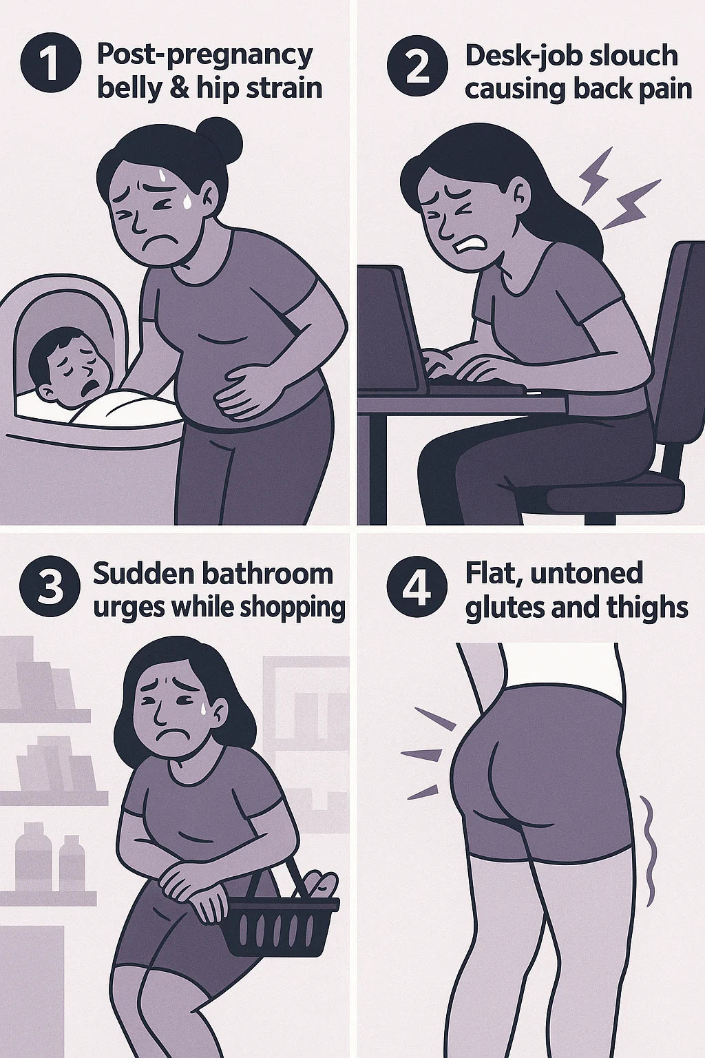 All four problems have a single root: under-trained inner-core and pelvic muscles. Strengthen them, and each issue starts fading.